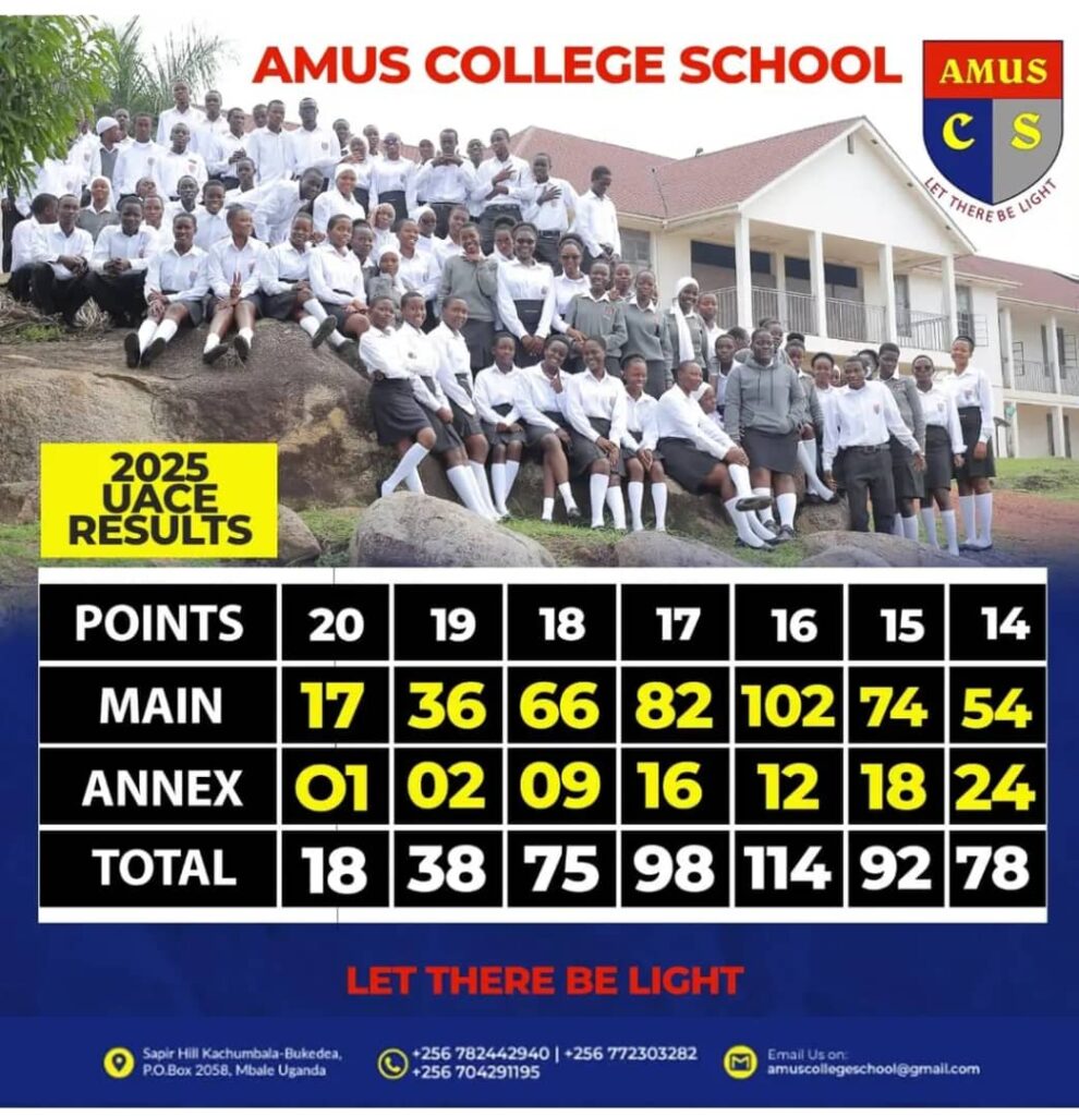Amus College School has once again demonstrated academic excellence after posting remarkable results in the 2025 Uganda Advanced Certificate of Education (UACE) examinations, with 18 students attaining the maximum 20 points.